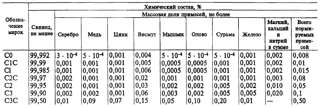 Согласно ГОСТ 3778-77, химический состав свинца С3 должен соответствовать следующим требованиям: